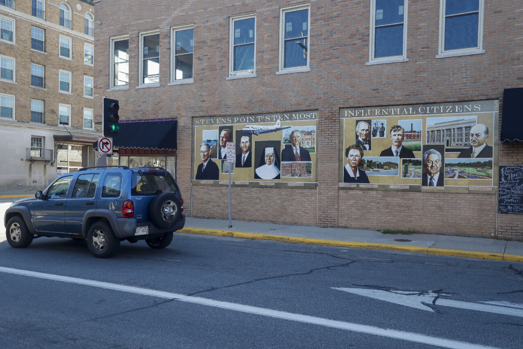 This mural is called “Stevens Point’s Ten Most Influential Citizens.” Painted by Kelly Meredith in 2008 for the city’s sesquicentennial, the mural depicts people who were voted to be the most influential. They include Fred Schmeeckle, Jules Iverson, K.B. Willett, Reverend Mother Mary Felicia Jaskulski, Lee Sherman Dreyfus, Ruth Gilfry, Albert G. Ellis, John Bukolt, John Joanis and Peter J. Jacobs.
